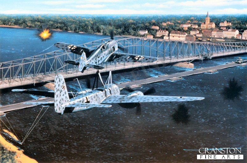 The grandfather of todays cruise missiles, the Mistel was the piggyback aircraft of the Luftwaffe during WW II. This combination aircraft arose out of research conducted to find a better means for towing gliders into combat. About two hundred of these combinations were ultimately built. The British had experimented with a piggyback combination of a commercial transport on the back of a flying boat in the late 1930s. The Mistel project in Germany had its share of skeptics. As the program evolved and Germanys strategic position in the War eroded, the Mistel project became focused on using unmanned obsolete Ju-88 bombers loaded to the gills with explosives as a very large guided bomb. The top aircraft in the combination, either a Bf-109 or Fw-190, would be piloted into the proximity of the target. A rudimentary guidance system would then be locked on the target, and the unmanned Ju-88 would fly itself into the target. Some Mistel combinations utilized normal looking Ju-88s, whereas others were fitted with a sinister-looking warhead in place of the cockpit. In the fall of 1944 the Luftwaffe laid plans for utilizing Mistels for attacks on Soviet targets like power plants and armament factories. Because the Ju-88 component only went one-way on these missions, the Mistels would have superior range and bomb capacity when compared to manned bombers. With Germanys forces in retreat at this point, the distances from the strategic Russian targets became even too great for the Mistel. Instead Mistels were targeted at key bridges, the destruction of which was designed to slow the advancing Red Army. The Last Mistel attack of the War took place in April of 1945. Four Mistel aircraft, with a hollow charge warhead instead of the normal Ju-88 cockpit, coupled to a top-mounted Fw-190 fighter were prepared at the Pennemunde airbase. The target for the operation would be the bridge over the river Oder at Tantow. One of the four aircraft encountered technical problems and had to jettison the Ju-88. The remaining three piloted by Lt. Dittman OFw Braun and Uffz Seitz proceeded to the target. They acquired an unexpected escort in the form of eight Bf-109s, but the fighters engaged Russian fighters along the route and the Mistels proceeded to their target alone. The Mistel piloted by Ofw Braun was hit by anti-aircraft fire and the Ju-88 was jettisoned prematurely. The Mistel piloted by Uffz Seitz was apparently shot down. Lt. Dittman, however, was able to lock the guidance system of his Ju-88 on the target, and flew his 190 safely to an alternate base.