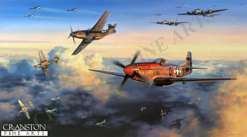 From the day they began their aerial campaign against Nazi Germany to the cessation of hostilities in 1945, the USAAF bomber crews plied their hazardous trade in broad daylight. This tactic may have enabled better sighting of targets, and possibly less danger of mid-air collisions, but the grievous penalty of flying daylight missions over enemy territory was the ever presence of enemy fighters. Though heavily armed, the heavy bombers of the American Eighth Air Force were no match against the fast, highly manoeuvrable Me109s, Fw190s and, late in the war, Me 262 jet fighters which the Luftwaffe sent up to intercept them. Without fighter escort they were sitting ducks, and inevitably paid a heavy price. Among others, one fighter group earned particular respect, gratitude, and praise from bomber crews for their escort tactics. The 356th FG stuck rigidly to the principle of tight bomber escort duty, their presence in tight formation with the bombers often being sufficient to deter enemy attack. Repeatedly passing up the opportunity to increase individual scores, the leadership determined it more important to bring the bombers home than claim another enemy fighter victory. As the air war progressed this philosophy brought about an unbreakable bond between heavy bomber crews and escort fighter pilots, and among those held in the highest esteem were the pilots of the 356th. Top scoring ace Donald J Strait, flying his P-51 D Mustang Jersey Jerk, together with pilots of the 356th Fighter Group, are seen in action against Luftwaffe Fw 190s while escorting B-17 bombers returning from a raid on German installations during the late winter of 1944. One minute all is orderly as the mighty bombers thunder their way homeward, the next minute enemy fighters are upon them and all hell breaks loose.