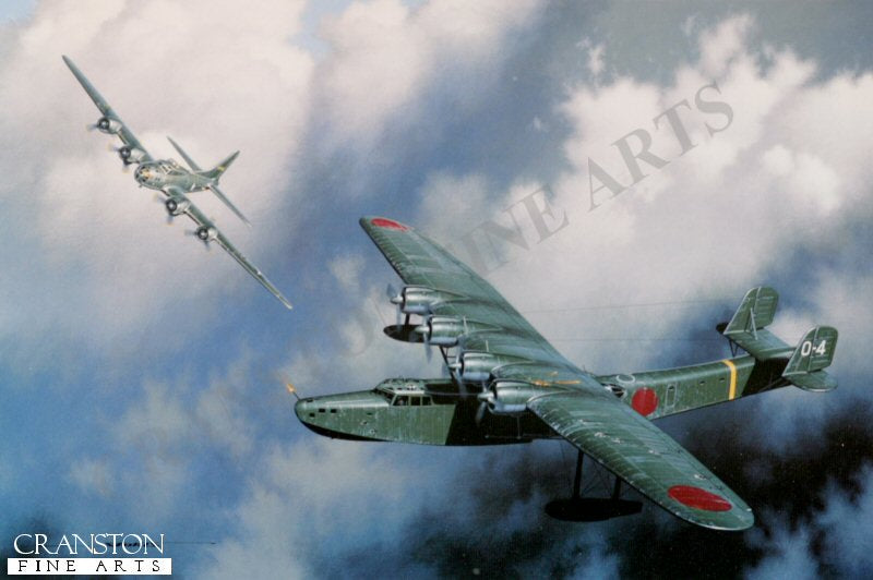 October 23, 1942 was a typical day for American troops at Esprito Santo, but for the crew of a B-17 Flying Fortress it would become a most memorable day. Early that morning the Japanese began shelling the field. Lt. Ed Loberg, a former farm boy from Wisconsin, was ordered to take his B-17 up for a reconnaissance mission to determine where the Japanese guns may be located. Not finding anything they returned to the field. The brakes failed on the B-17 upon landing, and they hit several parked Navy aircraft. Fortunately for Lobergs crew a 100 pound bomb dislodged in the crash did not explode. Later that day the crew boarded another B-17 and went hunting out to sea. Around mid-day the crew noticed a PBY being attacked by a Kawanishi H6K Mavis flying boat. Diving the B-17 straight down, the Mavis and the Flying Fortress soon entered a rain squall. The windows were black with clouds and rain, and the plane was buffeted by strong winds. Emerging from the squall at low altitude into blinding sunlight the B-17 emerged only fifty feet from their adversary. Immediately every gun on both aircraft began firing in a broadside exchange reminiscent of age old sailing ship battles. Thousands of bullets criss-crossed the narrow spread of air, and the Fortress shuddered from the impact. Tracer bullets from the B-17 pelted the Mavis like darts with many ricocheting off its armor. The Mavis made a tight turn, and Loberg turned inside him to avoid the mortal sting from the Mavis tail guns. In and out of rain squalls this interesting dogfight continued for 45 minutes. The Mavis kept very close to the wave tops to protect is vulnerable under belly. Several times during the fight the Mavis disappeared for three or four minutes into clouds, but each time as it reemerged Lobergs B-17 resumed the attack. Twice the B-17 passed over the H6K so close that the jagged bullet holes in the Mavis and the round glasses on its two pilots could be seen clearly. Finally, the Mavis began smoking, and the Japanese plane dropped into the sea and exploded in a large ball of flame. In the words of Ira Wolfert, a war correspondent, who was on the flight; During the duel, the Fort that I was on, with a bullet in one of its motors, and two holes as big as Derby hats in its wings, made tight turns with half-rolls and banks past vertical. That is, it frequently stood against the sea on one wing like a ballet dancer balancing on one point, and occasionally it went over even farther than that and started lifting its belly toward the sky in desperate effort to keep the Jap from turning inside it... Throughout the entire forty-four minutes, the plane, one of the oldest being used in the war, ran at top speed, shaking and rippling all over like a skirt in a gale, so many inches of mercury being blown into its motors by the superchargers that the pilot and co-pilot, in addition to their other worries, had to keep an eye on the cowlings to watch for cylinder heads popping up through them. Others on Lobergs crew that day were B. Thurston the co-pilot, R Spitzer the navigator, R. Mitchell the bombadier and E. Gustafson , E. Jung, G. Holbert , E. Smith, and P. Butterbaugh who manned the guns during this unusual dogfight. Both Mitchell and Spitzer were wounded during the battle.