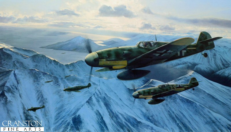 Occupied by the Germans, by 1942 Norway had become vital to Hitlers war in the East. With the Russians threatening to over-run Finland and attack Norway, the pilots of JG5 were tasked to support German ground forces, and to escort the incessant Luftwaffe attacks on Arctic Convoys from Britain to the vital Russian ports of Murmansk and Archangel. With such unpredictably harsh weather it was a life or death battle fought under extreme conditions. For the pilots of JG5 - Eismeer, the Polar Sea Group, the sun never set during the long summer months, and due to constant fog and storms it was often impossible for pilots to return to base, often diverting to other airstrips. But their darkest moment came in December 1944 when their Kommodore, Heinrich Ehrler, one of the Luftwaffes most brilliant fighter leaders, was made a scapegoat following the sinking of the German battleship Tirpitz in a Norwegian fjord. Despite holding the Knights Cross with Oak Leaves and nominated for the Swords, he was convicted. High in the Arctic Circle a bitter war of attrition was fought in freezing, unforgiving conditions, the desperate conflict played out against a majestic, awe-inspiring backdrop of beautiful ice-clad mountains. Richard Taylors spectacular painting portrays the Me109s of 6./JG5 led by Oberleutnant Heinrich Ehrler, while based at Petsamo in Finland, as they soar high above the towering peaks of ice capped mountains glistening in the cold polar air, March 1943. Their dawn patrol keeps constant vigil along the glacial fjords of the Norways far-northern coastline, as the majestic vista gives the battle-hardened Me109 pilots a brief moment of tranquility far removed from the grim and bitter battles being fought below.