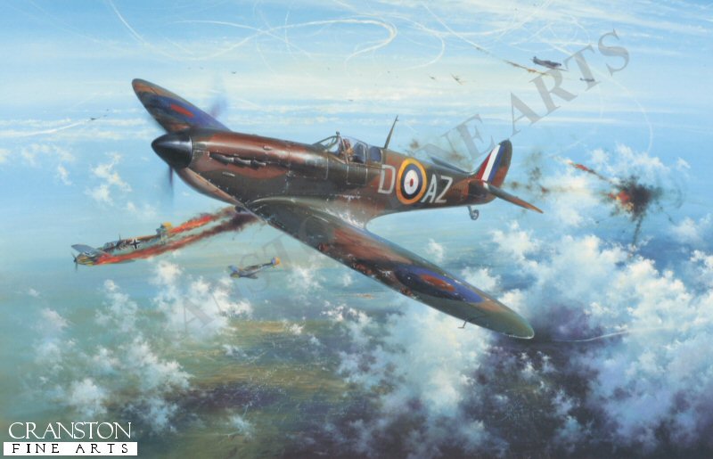 Simon Atack has recreated an action flown by Pilot Officer Bob Doe during a fierce battle over the south coast, near the Isle of Wight on 18th August, 1940. Flying a Mk I Spitfire of No 234 Squadron, Boe Doe is seen bringing down an Me109 High over Southampton, one of 14 Victories he achieved during the Battle of Britain. The third highest scoring fighter pilot of the battle, 20 year old Bob Doe was one of the few Aces to fly both Spitfires and Hurricanes during the battle. Simon captures the very essence of the most tumultous of all aerial conflicts in his dramatic painting, August Victory, with Bob flying his trusted Spitfire, D for Doe.