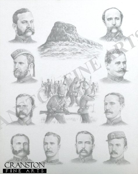 The centre drawing shows the last groups of soldiers of the 24th South Wales Borderers at Isandhlwana during the last of the battle as the force consisting of 2 guns and 70 men of N Battery, 5th Brigade, Royal Artillery, 5 companies of 1st Battalion, the 24th Foot, 1 company of 2nd Battalion, the 24th Foot, Mounted volunteers and Natal Police and two companies of the Natal Native Infantry is overrun by superior numbers of Zulu warriors. Surrounding the centre drawing are portraits of some of the main figures. These are from top left : Lieutenant Colonel H B Pulleine 24th Regt, Lieutenant N J A Coghill 1/24th Regt, Quartermaster E Bloomfield 2/24th Regt, Captain R Younghusband 1/24th Regt, Private S Wassall VC 80th Regt, Brevet Major S Smith Royal Artillery, Brevet Colonel A W Durnford Royal Engineers, Lieutenant T Melville VC 1/24th Regt, Lieutenant H Smith-Dorrien 95th Regt and Lieutenant C D Pope 2/24th Regt. The losses during the battle were 52 British officers and 806 non-commissioned ranks and 471 Africans died fighting for the British. Zulu warrior dead were around 2,000 dead either on the field or from wounds. There were only around 60 Europeans who survived the battle.