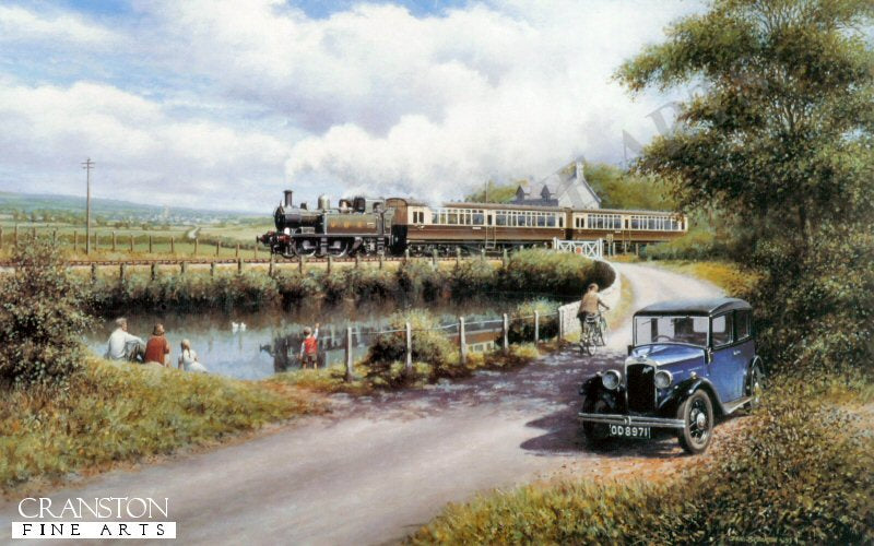 A 1930s steam locomotive on the Great Western Railway passes through a level crossing, while a family sit on the embankment with their blue Austin 7 parked nearby.