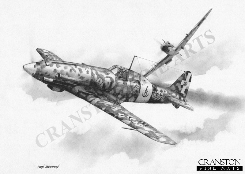George Beurling's Spitfire Vc shooting down the Macchi 202 of Italian Faliero Gellis over Malta. The crippled aircraft had been hit in the engine and radiator, but he managed to crash-land it and survived as a prisoner of war. This was the same day that Beurling also shot down Italian ace Furio Niclot and a probable Messerschmitt Bf.109.