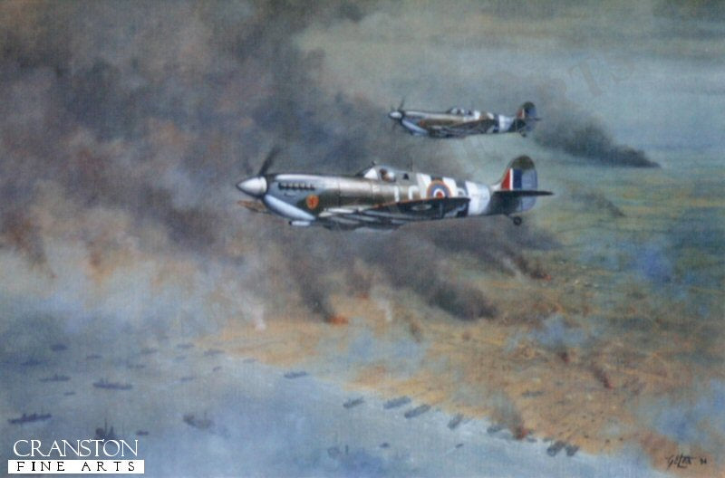 Spitfires of 602 City of Glasgow Squadron in the disitnctive white stripe marking of the d- day invasion patrol the Normandy beaches. Seen below are the landing craft and ships of the invasion force as the troops form Britian, America, Canada invade the Normandy Beaches, coded Juno. Gold, Sword and Utah.