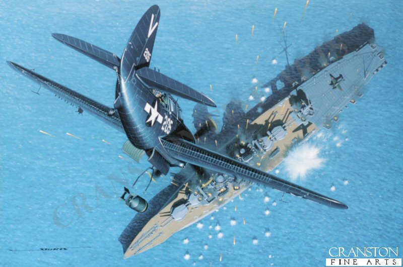 On July 24, 1945, Air Group 87 on board the USS Ticonderoga was informed that the Hyuga, anchored off a small island near Kure, Japan, would be its target. The ship, a WW I vintage battleship which had been modernized in 1936, and later converted to part battleship and part sea plane tender, would be a formidable objective with its impressive firepower and the fact that its location would place the attackers in the line of fire of numerous shore batteries. The ship was 704 feet in length, displaced 39,000 tons, and carried a compliment of Aichi E16A1 Zuiun reconaissance aircraft which were code named Paul by the Allies. Lt Cdr. Kanaga would lead the squadrons Curtiss SB2C Helldivers on the attack. Each of the twelve Helldivers would carry a 1,000 pound bomb in the internal bomb bay, a 260 pound fragmentation bomb under one wing and a droppable wing tank under the other wing. The drop tank weighed substantially more than the 260 pounder so it was anticipated that the Helldivers might be a bit unstable on takeoff. The first aircraft launched, that of Lt. Al Matteson, went into a immediate hard right turn given the uneven wing loading, and hit the water hard. The other Helldivers managed to become airborne, and eventually joined up for the outbound leg of the mission. The plan was for the Helldivers to dive bomb the Hyuga while torpedo bombers made glide bombing attacks, as the water was too shallow for use of torpedoes. In Stan Stokes painting entitled Big Tailed Beast, an SB2C-4E piloted by Lt. H. Paul Brehm pulls out over its target. Anti-aircraft fire is fierce, and the Hyuga is partially obscured by the incredible amount of smoke being generated by its AA guns. Lt. Brehm has decided to make his dive without dive flaps, hoping to make himself a faster moving target for the Hyugas gunners. During Brehms dive, the SB2C of Lt. Vaughn, which was immediately in front of him, went straight down, crashing next to the Hyuga in a great splash of white foam. Brehm released his bomb and pulled out very low over the target. He momentarily blacked out, and his windscreen fogged over. Brehm and his gunner W. Tommy Thompson, could feel the jolt from their 1000 pounder as it scored a direct hit. Returning to their Task Force low on fuel and in bad weather, Brehm was forced to ditch his Helldiver, but he and Thompson were rescued within minutes by the USS Chauncey. The mission was successful, but was not without cost as more than half the attacking Helldivers failed to return safely. The Curtiss SB2C was the last combat aircraft produced by Curtiss-Wright for the US Navy. The aircraft entered service in late 1943 supplementing the Navys SBD Dauntless dive bomber force. More than 7,000 of these large single engine aircraft were produced, with the most widely produced variant being the SB2C-4. Helldivers were capable of carrying a 2,000 pound bomb load, and could also be modified to be used in the torpedo bombing role. Referred to as The Big Tailed Beast by many of its pilots, the Helldiver had a top speed approaching 280-MPH, but also had the reputation of being one of the most difficult carrier based aircraft to land. As a result, many of the Helldivers lost during the War were victims of landing accidents.