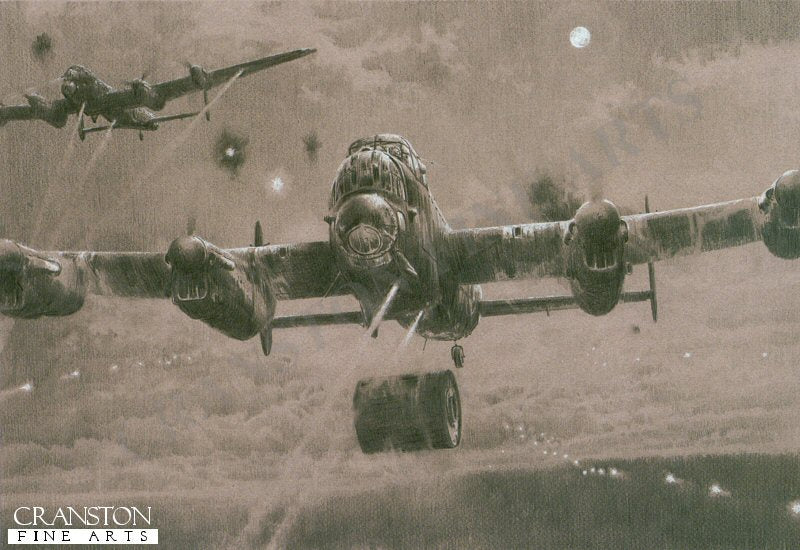 On the night of 16th - 17th May 1943 nineteen specially modified Lancasters of No.617 Squadron departed from RAF Scampton in Lincolnshire on one of the most secret and daring bombing operations undertaken during World War Two. The ultra-secret operation to destroy the huge hydro-electric dams that powered a significant part of Germany's industrial war machine in the Ruhr valley, codenamed Operation Chastise, had been planned in stealth for months. Using a revolutionary 10-ton 'bouncing bomb' designed by the brilliant designer Barnes-Wallis, a special squadron comprised of the most talented crews that RAF Bomber Command could muster would be formed to attack primarily the Möhne, Eder and Sorpe dams. Using highly modified Lancaster bombers to carry the secret bomb, Operation Chastise.was to become one of the most dangerous precision bombing raids ever undertaken, and Robert Taylor astutely captures all the atmosphere in his drawing Bomb Away!. At 00.38 hrs the attack on the Möhne dam is already well underway. The Commander of No.617 Squadron and leader of the raid, Wing Commander Guy Gibson, had made the first successful attack, but the dam wall held firm. Tragedy then struck as Flight Lieutenant Hopgood's Lancaster, hit by flak during his attack, exploded in a ball of flame. Gibson called in Flick Lieutenant Mick Martin to make the third assault. As enemy flak and tracer illuminate the night sky, Guy Gibson boldly attempts to draw the enemy's fire as Martin holds Lancaster AJ-P steady at 60ft above the waters of the Möhne dam to release the cylindrical, bouncing bomb and send it spinning towards the dam wall. In a few moments a huge explosion will erupt up into the night sky as the hydrostatic bomb detonates against this might granite wall. Once again though, the öhne dam held, but not for long. Following Martin, Squadron Leader Dinghy Young would approach in Lancaster AJ-A, his bomb also successfully hitting the target but this time the dam, already weakened, will slowly crack. Water will start to seep through the granite wall as Squadron Leader David Maltby in Lancaster AJ-J finishes the job. With a thunderous roar the Möhne dam was breached, its waters unleashed like a giant tidal wave sweeping through the valley below.