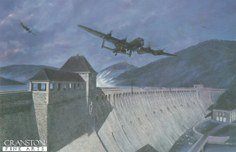 On the night of 16th / 17th May 1943, Lancasters of 617 Squadron under the command of Wing Commander Guy Gibson attacked the hydroelectric dams of the Ruhr. Five of the aircraft that successfully attacked and breached the Mohne flew onto the Eder, only three with the Upkeep bombs still on board. Whilst there was no flak, the approach, over difficult terrain, was hazardous and a tremendous test of skills of the crews involved. Pilot Officer Les Knights aircraft, AFN, can be seen having just dropped the last of the groups bombs, which actually breached the dam, and is climbing steeply to avoid the hill behind the dam.