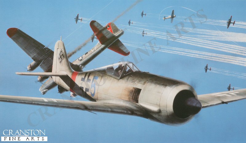 It was in 1941 that the remarkable Focke-Wulfe FW190 first appeared in the skies of Europe, quickly establishing itself as a most formidable adversary. It proved to be the supreme weapon against all allied bomber forces. Here FW190A-8 of 1 Gruppe, Jagdgeschwader 1 is shown attacking a B17G of 381st Bomb Group during a critical defence of the Reich in 1944.