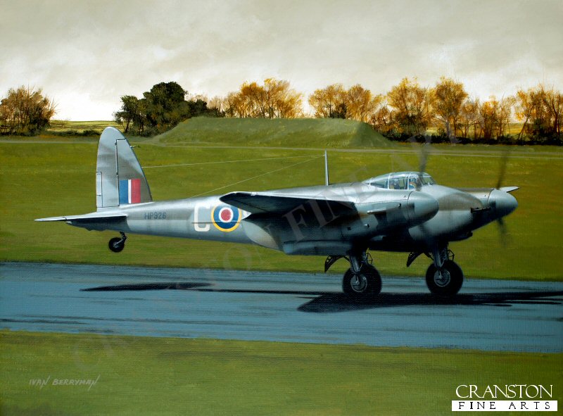 Mosquito HP926 SB-C Charlie of No.464 Sqn RAAF gets airborne from Hunsdon on 28th February 1944. The crew, Flying Officer David Avery RNZAF and Warrant Officer Leslie Brodie RAAF are shown embarking on what would be an eventful 'Noball' mission over France. The aircraft was damaged by flak with sections of the tailplane and rudder shot away, but with remarkable skill, Flying Officer Avery wrestled the aircraft back across the Channel. The doomed Mosquito was aimed back towards the sea before the crew took to their parachutes near Chichester, and it crashed harmlessly.