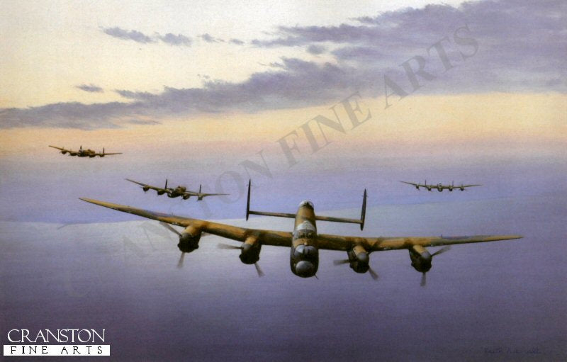 A flight of Lancaster bombers from a Bomber Command squadron climb away from the British coastline on yet another bombing raid on Nazi held Europe. A superb painting and a great tribute to the crews of the Lancaster bomber squadrons.