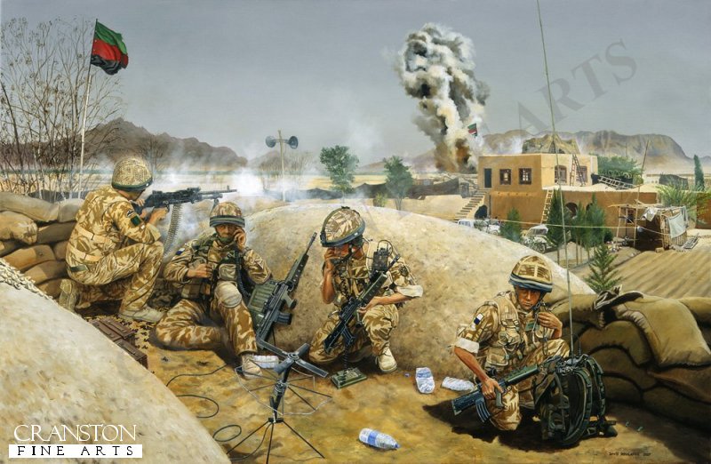 16 Air Assault Brigade deployed on Operation HERRICK, Afghanistan, from March to October 2006. The establishment of Combat Outposts and District Centres within Helmand Province by the 3 PARA Battlegroup was a key element of the operation. Throughout the deployment, the soldiers in these remote and austere locations were involved in some of the most intense fighting for a generation. This scene of the Combat Outpost in Now Zad depicts one of the Rear Link Detachments of 216 Parachute Signal Squadron which established and maintained vital communication links to both the Battlegroup and Brigade Headquarters from all of the isolated outposts.