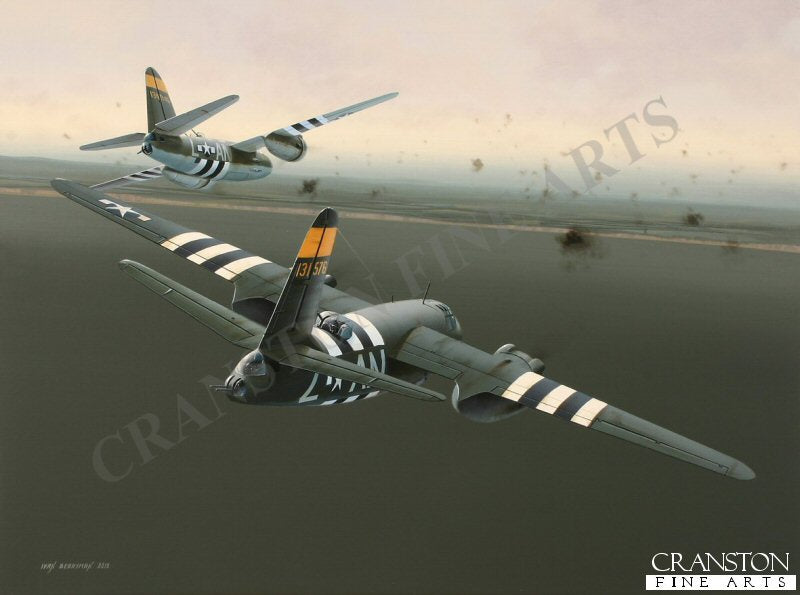 Martin B.26 Marauders of the 553rd Bomb Squadron, 386th Bomb Group are depicted approaching the Normandy coast early on 6th June 1944. These aircraft were among the first to bomb the enemy gun emplacements and reinforcements situated along the beaches in order to help clear the way for the Allied landings that were just hours away at the start of Operation Overlord. These B.26s carried out low level bombing sorties over Utah Beach, their low altitude being the key to their high level of success and accuracy. Nearest aircraft is 131576 AN-Z 'Dinah Might' now on display at the Utah Beach Museum.