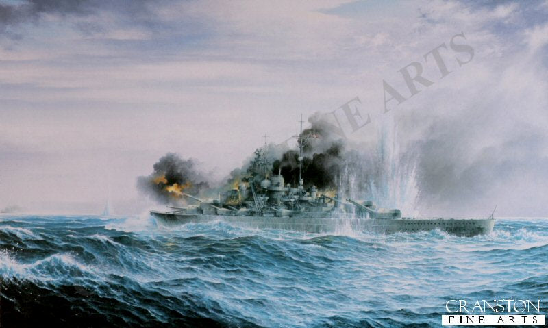 The battered Bismarck fires its final salvos, during the last stage of the battle, 27th May 1941.