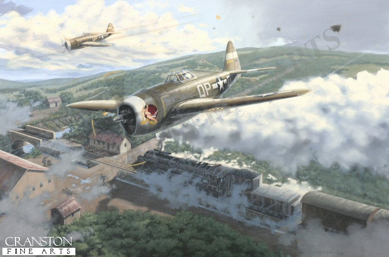 Colonel Steve Pisanos and his wingman in their P-47 Thunderbolts take an opportunity to attack a German train in France, 1944.