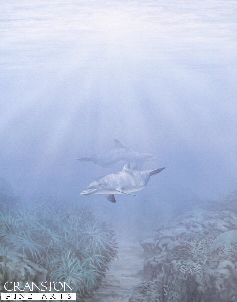 As the sun breaks through the clear blue waters, two dolphins swim above the seabed.