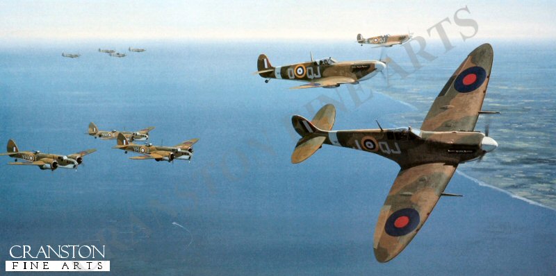 Royal Air Force Spitfires of No.616 (South Yorkshire) Squadron escort returning Bristol Blenheims of No.21 Squadron from a bombing mission over France.