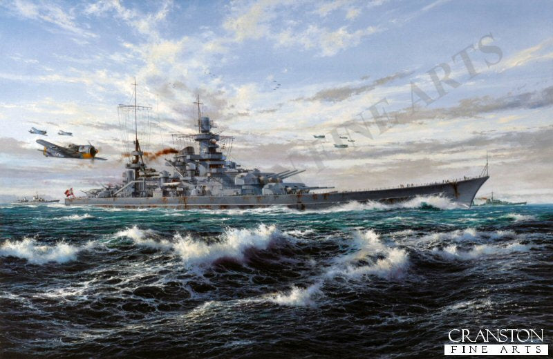 When the German battleships Scharnhorst and Gneisenau entered Brest in March, 1941, between them they had sunk a total of 22 ships during their North Atlantic operations. Laying in port however, they became a target for constant air attack, Scharnhorst being damaged by bombs, and in February 1942 the decision was made to break out with the famous Channel Dash. Scharnhorst led the flotilla in a daring passage through the English Channel, heading for the sanctuary of Wilhelmshaven. They all got through but, striking two mines en-route, it was March 1943 before the Scharnhorst was able to resume battle operations when, under heavy escort, she sailed for Norway. Simon Atacks panoramic seascape depicts a scene from Operation Paderborn as Scharnhorst ploughs through a lively swell with Fw190s of I./JG5, based at Oslo Fornebu, providing fighter cover. Steaming in company with destroyers Z-28 and Erich Steinbrinck, the mighty German battleship has departed Gotenhafen and is heading towards Bogen Bay, near Narvik in Norway. But Scharnhorsts days were numbered. On 26 December 1943 the huge battleship attacked a convoy off North Cape, but in the heavy seas Scharnhorst became detached from her destroyer escort. With the British Home Fleet aware of her position, and intentions, she was intercepted, the Britishbattleship Duke of York landing a barrage of 14-inch shells on the mighty German warship. The blows were fatal, the coup-de-grace coming shortly after, when 11 torpedoes sent the magnificent but deadly battleship quickly to the bottom. There were just 36 survivors.