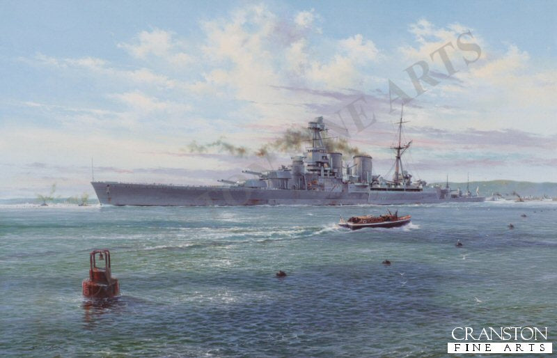 HMS Hood, Britains largest warship and pride of the Royal Navy, steams majestically through the Swept Channel on 22 May, 1941. Having fuelled at the Scapa Flow naval base in Scotland, she steers clear of floats suspending torpedo and submarine nets, as she heads for open water and the North Sea. The crew of a naval cutter wave farewell as the mighty battleship departs upon what will prove to be her final voyage.