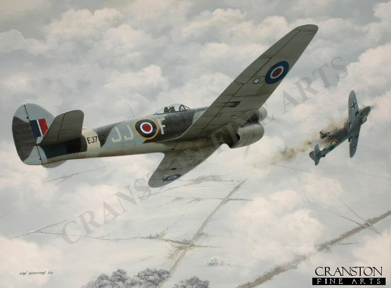 Flying his last mission with his old mount, Hawker Tempest EJ762, fresh from repair after being damaged by flak, David Fairbanks found himself embroiled in a fierce battle with Messerschmitt Bf109s on 17th December 1944. In the course of the combat, Fairbanks shot down two of the enemy aircraft and damaged another before returning safely.
