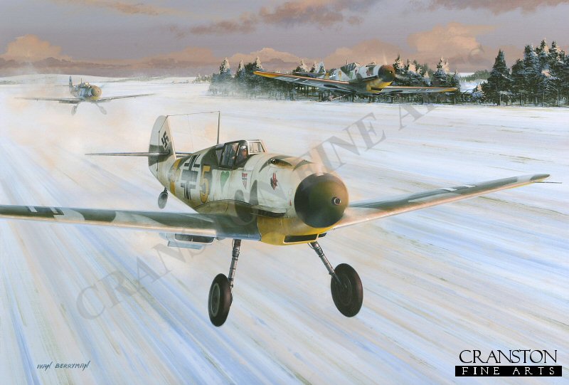 Situated 40 miles south west of Leningrad, the German occupied airfield at Siverskaya is now home to the famous Grunherz or Green Hearts of Jagdgeschwader 54. The harsh Russian winter of 1941 is starting to take hold as three Messerschmitt Bf109F-4 Friedrichs from III Gruppe take off into early morning sunshine to act as fighter escort to Stuka attacks on the Soviet fleet in Kronstadt Harbour. With its wheel covers removed to prevent snow jamming the undercarriage, lead aircraft Yellow 5 already shows signs of weathering to the partial whitewash hastily applied over summer camouflage.