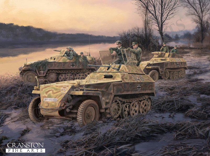 Reconnaissance team of 116th Panzer Division, river Our, Ardennes, 18th December 1944. Sdkfz 250 Reconnaissance halftracks from the 116th "Windhund" (Greyhound) Panzer Division, searching for a suitable crossing point across the Our river during the opening stages of the Battle of the Bulge.