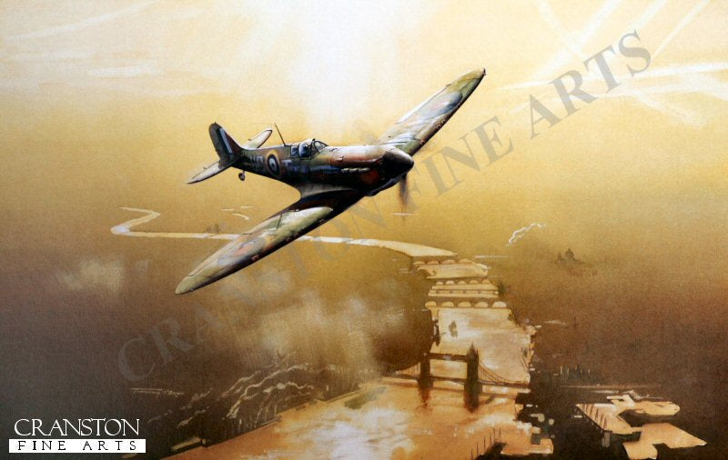 A lone Spitfire of 266 Squadron is shown above the sunlit haze of London and the Thames, during the Battle of Britian. 266 Squadron was reformed on 30th October 1939 at RAF Sutton Bridge as a fighter squadron. The squadron was one of the Rhodesian gift squadrons and was named 266 (Rhodesia) Squadron in honour of the gift. Originally it was equipped with the Fairey Battle light bomber, but soon after in January 1940 it received the Supermarine Spitfire and became a fighter squadron. It was in action over Dunkirk in early June and fought in the Battle of Britain.
