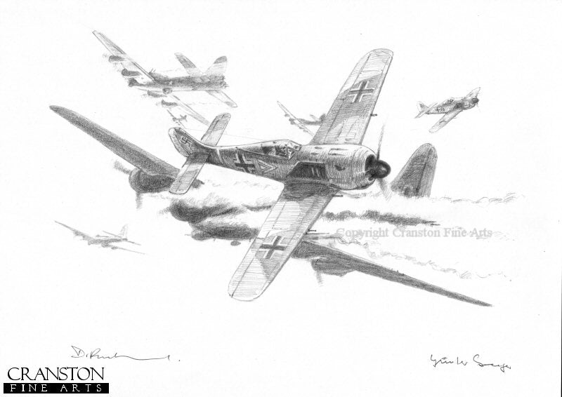 St Nazaire, France, 1st January 1943. Leading the Focke Wulf 190s of III Gruppe, Jagdgeswader 2, Gruppenkommandeur Egon Mayer, cut a swathe through the attacking waves of US Eigth Airforce B17s. The recently developed tactic of the head on pass was proving successful against the daylight heavy bombers, with Mayer claiming 2 for himself in this engagement.