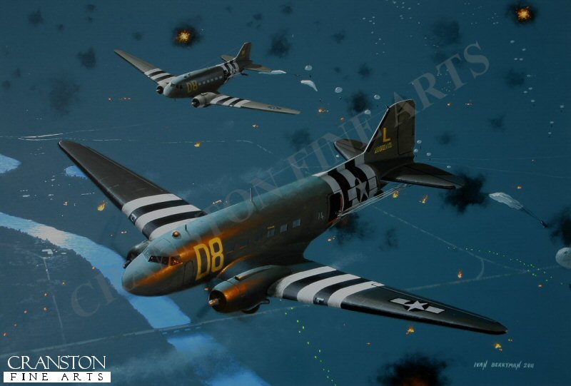 Douglas C-47s of the 439th Troop Carrier Group from Upottery, East Devon, try to hold steady amid a barrage of flak and anti aircraft fire as troops of 101st jump into the unknown above Normandy on the night of 5th / 6th June 1944. These aircraft are of the 94th Troop Carrier Squadron.