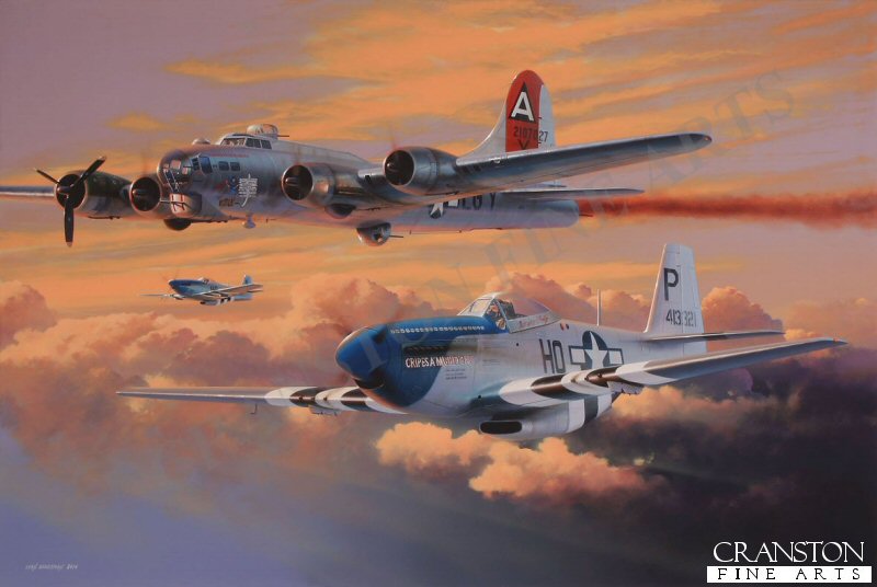 B-17G 2107027 is depicted limping home to Bassingbourn with the starboard outer propeller feathered following a raid during the Summer of 1944. 'Hikin' for Home' served with the 322nd Bomb Sqn, 91st Bomb Group as part of the 8th Air Force. Escorting her home is Major George Preddy, the highest scoring P-51 pilot and sixth in the list of all-time top American Aces, seen here flying 413321 'Cripes a Mighty 3rd'.