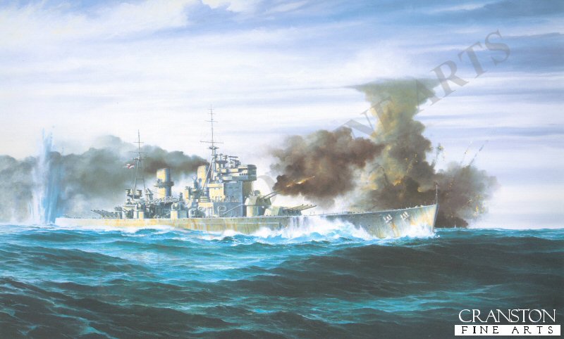 HMS Prince of Wales is shown firing on the Bismarck and in the background a huge black cloud is all that is left of HMS Hood.
