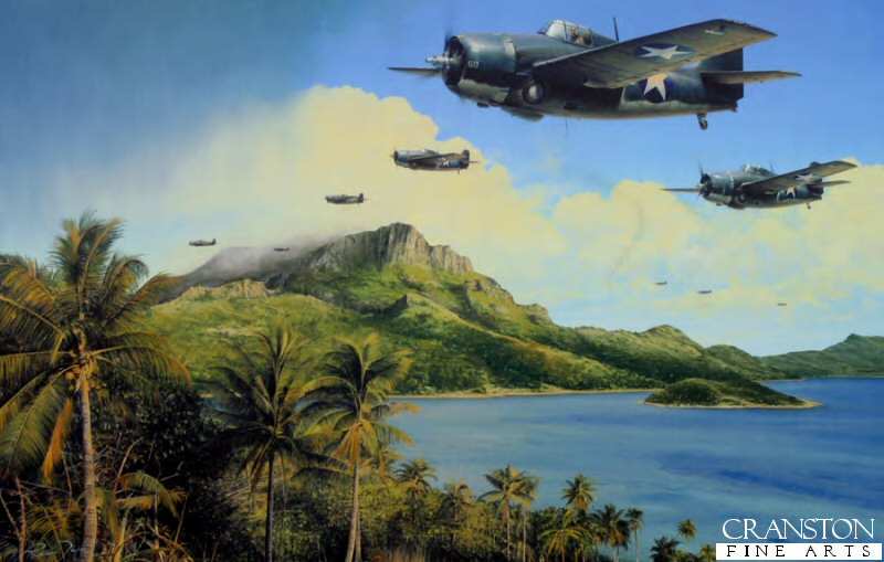 On 7 August 1942, just eight months after the dramatic events at Pearl Harbor, the United States First Marine Division stormed ashore on the island of Guadalcanal. It was the opening gambit of the land war in the Pacific. The painting depicts Captain Joe Foss as he leads the F4F Wildcats of VMF-121 back to Henderson Field after a day of desperate fighting against the Japanese in the skies over the steaming jungles of Guadalcanal in November 1942 - it would be another three months before the island was finally secured during which time Joe Foss would achieve an astonishing 26 victories to become the first American pilot to equal WW1 Ace Eddie Rickenbackers score.