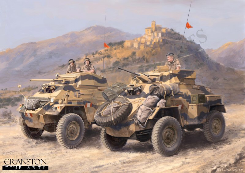 6th Armoured Division, Italy, May, 1944. Humber Mk II & IV armoured cars of the 1st Derbyshire Yeomanry Regiment, on reconnaissance near Monte Cassino.