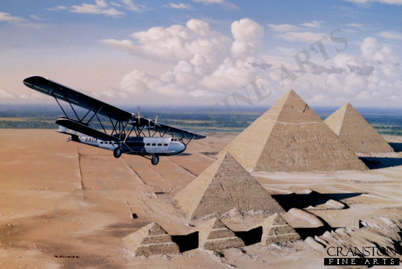 The Handley Page H.P. 42 biplane airliner had a reputation unmatched in its day for reliability, safety, and passenger comfort. Imperial Airways, the British flag carrier during the between war period, was one of aviations pioneers when it came to establishing long range commercial air services. With the British Empire spanning the globe, effective long distance air service was important in linking both former and current colonies. In 1928 Imperial solicited proposals for a long distance airplane capable of flying the London to India air mail route. Handley Page won the bid for a total of eight new airliners. The large bi-plane design which was agreed upon had four radial engines, with two mounted on the upper wing and two on the lower wings on each side of the fuselage. With its triple finned tail assembly, this huge biplane was quite something to see. Despite its antiquated appearance the H.P. 42 had a very impressive passenger compartment which was quite luxurious. Inlaid wood paneling, twin lavatories, a full galley, comfortable seating, passenger ventilation controls, and wide windows gave the H.P. 42 ambiance comparable to some of the ocean liners of the day. The slight kink in the aircrafts fuselage gave rise to its flying banana nickname. Four aircraft were built for Imperials eastern route structure, which included the India and South Africa routes. These aircraft were powered by 9-cylinder 550-HP Bristol radials. The other four aircraft were utilized for the London-Paris shuttle and other continental routes, and were powered by a different engine, and contained a total of 38 passenger seats instead of the 24 passenger configuration for the longer routes. The H.P. 42 had a corrugated metal skin similar to both the Ford and Junkers Tri-motor designs of that era. With a cruising speed of only about 100-MPH the passenger amenities on these aircraft were greatly appreciated, especially if a stiff headwind was encountered. The aircraft, with its large wing area, had an incredibly short take off capability, and could become airborne in only 600 feet. As depicted in Stan Stokes painting Hannibal passes over the Pyramids in Egypt on its approach into Cairo, one of the stop over points on the London to India route. This journey would take more than six days, with no flying at night. Occasionally these aircraft would make stops at unattended desert fuel depots in order to refuel. These aircraft were in service for about eight years, with most of them attaining more than one million flight miles. The eight aircraft in the fleet, Hengist, Helena, Horatius, Hannibal, Heracles, Horsa, Hanno, and Hadrian chalked up more than 100,000 flight hours covering more than 10 million miles. Only one aircraft was lost in a fatal accident, as Hannibal disappeared over the Indian Ocean while being ferried back to England.