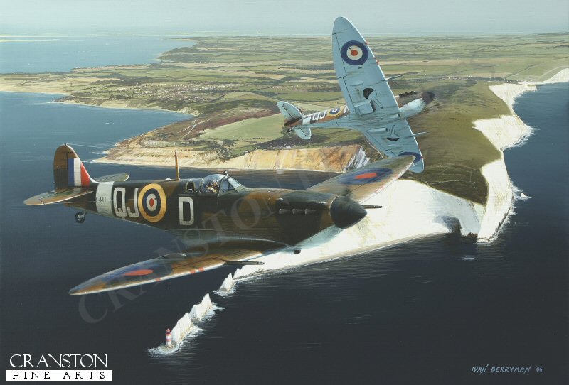 Two Spitfire Mk1Bs of 92 Squadron patrol the south coast from their temporary base at Ford, here passing over the Needles rocks, Isle of Wight, in the Spring of 1942.