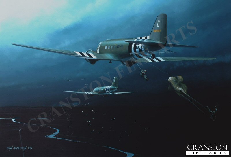 Douglas C-47s of the 91st Troop Carrier Squadron, 439th Troop Carrier Group deploy the 101st Airborne Division above the drop zone on the night of 5th/6th June 1944 at the start of Operation Overlord.