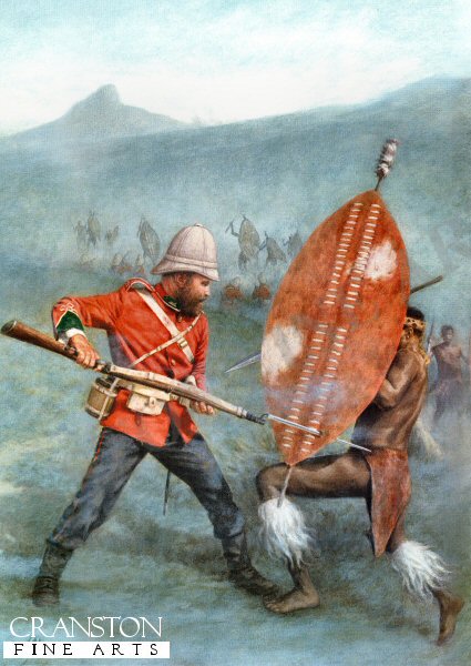 A solitary soldier of the 24th Reg. fights off the Zulu warrior in hand to hand combat with bayonet fixed as many more advance on him to seal his fate. Last stand of the 24th South Wales Borderers at Isandhlwana during the Zulu War. The battle of Isandhlwana, a Zulu victory over the British forces on 22nd January 1879 about 100km north of Durban. Lord Chelmsford led a column of forces to seek out the Zulu army camped at Isandhlwana, while patrols searched the district. After receiving a report, Chelmsford set forth at half strength, leaving six companies of the 24th Regiment, two guns, some Colonial Volunteers and a native contingent (in all about 1,800 troops) at the camp. Later that morning an advanced post warned of an approaching Zulu army. Shortly after this, thousands of Zulus were found hidden in a ravine by a mounted patrol but as the patrol set off to warn the camp, the Zulus followed. At the orders of the Camp Commander, troops spread out around the perimeter of the camp, but the Zulu army broke through their defences. The native contingent who fled during the attack were hunted down and killed. The remaining troops of the 24th Regiment, 534 soldiers and 21 officers, were killed where they fought. The Zulus left no one alive, taking no prisoners and leaving no wounded or missing. About 300 Africans and 50 Europeans escaped the attack. Consequently, the invasion of Zulu country was delayed while reinforcements arrived from Britain.