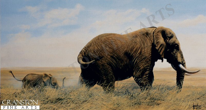 Jonathon Truss has captured the mighty and the small in this terrific painting of a large male elephant with a very small baby calf trying to keep up.