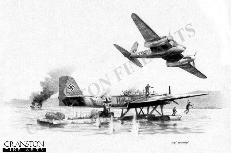 Banff Mosquito H of 404 Squadron flown on its first operational mission by Flying Officer A Catrano and Flight Lieutenant A E Foord spots a German Blohm and Voss Bv138 anchored off Kjevik. They attacked the Bv138 which blew up before going on to attack a Heinkel He115 floatplane which was in the vicinity. This drawing shows the Mosquito making its attack on the Heinkel as the Bv138 explodes in the distance.