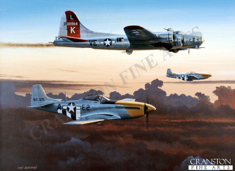 A pair of P51D Mustangs of the 361st Fighter Group, 8th Air Force, escort a damaged B17G Flying Fortress of the 381st Bomb Group back to its home base of Ridgewell, England, during the Autumn of 1944.