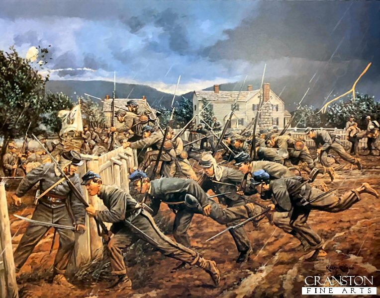 Throughout that Sunday, May 15th, 1864, the Federal and Confederate armies fought over possession of Jacob Bushong's orchard and wheat field near the town of New Market, Virginia.Suffering the combined effect of the Union muskets and artillery's canister rounds, the center of the rebel line, companies from 51st, 30th and 62nd Virginia regiments evaporated. Confederate General Breckinridge quickly realized his options: repair the gap in his line or fall back. With the VMI cadets as his only available reserve, he hesitated. 'Put the boys in,' he commanded at last, 'And may God forgive me for the order.'The cadets moved forward in characteristic parade ground precision, suffering their first casualties as they descended the slope leading towards Bushong's Farm. The fire intensified around the outbuildings and the mud pulled at their boots. Struggling forward through the churned up barnyard, they crossed the white farm fences, reaching the rail fence on the north edge of the orchard. Letting loose a volley, the fresh, excited cadets filled the gap in the faltering Confederate line.Once again the Confederate forces moved forward. Sigel attempted to organize a counterattack but unsupported, this force collapsed and retreated to the north followed closely by the deterioration of the entire Union line. The Confederates now rushed into the wheat field and through the position just moments before defended by Union cannoniers.The cadets briefly engaged the few remaining Federals of Von Klieser's Battery still attempting to defend their cannon. Six foot two inch Oliver Evans jumped up on the captured cannon, madly waving the VMI flag as the cadets cheered wildly.'Well done, Virginians,' was Breckinridge's praise, delivered on the battlefield evermore associated with the cadets of VMI.