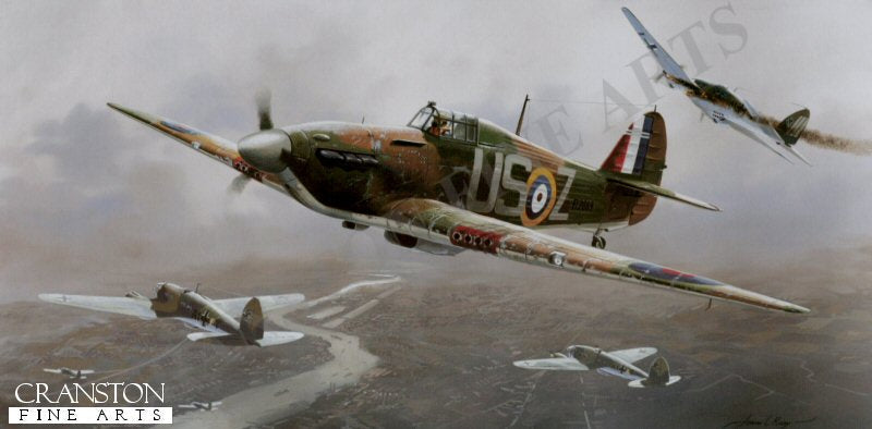 Like many others, the Hurricanes of No.56 Squadron were frequently scrambled to attack German formations heading for London. Flight Lieutenant E J Gracie flew with No.56 Sqn from their base at North Weald in his Hurricane MkI. Like many squadrons, his was frequently scambled to attack enemy formations heading for London. This painting depicts one such action over the eastern half of the city, the Thames being used as a landmark by the Luftwaffe. Gracies aircraft displays a good deal of wear and tear as there was little time for cosmetic work to be done in the workshops. Gracie was hit in action and forced to crash land his badly damaged aircraft. He escaped apparently uninjured, but was diagnosed with a broken neck some two days later!