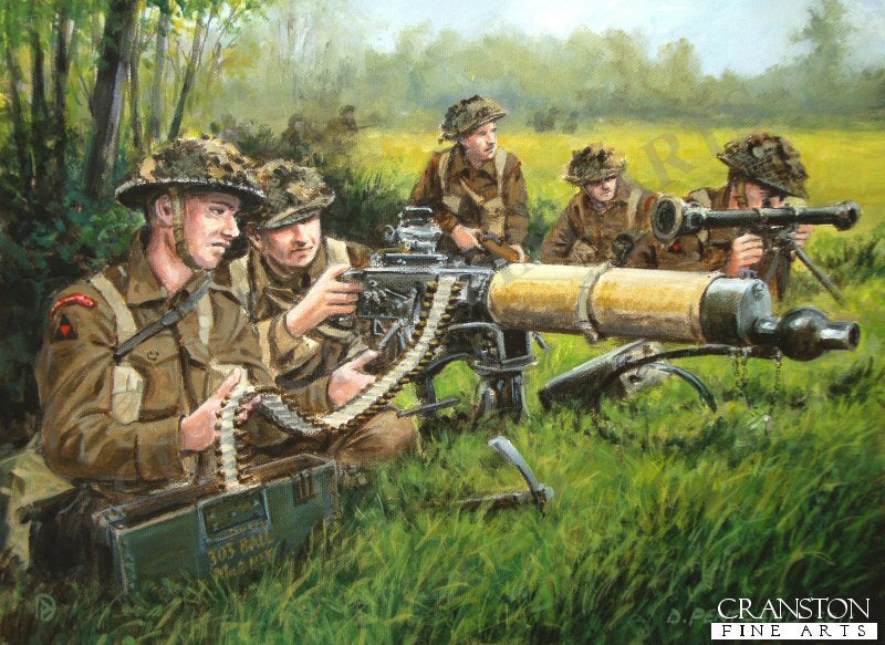Near Caen, D-Day, 6th June 1944. Vickers heavy machinegun team of the British 3rd Division, Monty's Ironsides, in action against the German strong points Morris and Hillman. The division comprised of the 2nd East Yorkshires, 1st South Lancashires, 1st Suffolks, 2nd Lincolnshires, 1st King's Own Scottish Borderers, 2nd Royal Ulster Rifles, 2nd Warwickshires, 1st Norfolks, and 2nd King's Shropshire Light Infantry.