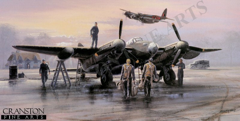Groundcrew busy themselves readying their de Havilland Mosquito as the aircrew head out towards the aeroplane for yet another mission to a high value target over occupied Europe during WW2. Their dangerous job as Pathfinders is to accurately mark and bomb the target for the main heavy bomber force. It required great skill in navigation, airmanship and courage. The Mosquito proved to be a real thoroughbred and ideal for many varied combat sorties so earning the nick-name The Wooden Wonder.