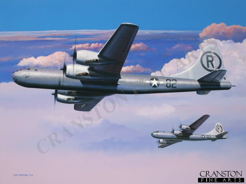 Assigned to the 393rd Bombardment Squadron, USAAF, Enola Gay was one of 15 Boeing B-29s with the 'Silverplate' modifications necessary to deliver the new atomic weapons. She is depicted here in company with The Great Artiste, one of the other two B-29s that took part in the first nuclear bombing mission against the Japanese city of Hiroshima on 6th August 1945. The three ship mission consisted of Enola Gay (victor number 82), piloted by Colonel Paul W Tibbets, The Great Artiste (89), piloted by Major Charles W Sweeney and number 91, later named Necessary Evil, piloted by Captain George W Marquardt. Tibbets' aircraft was assigned for weapons delivery, whilst Sweeney's carried blast measurement instrumentation and Marquardt's was the camera ship. This mission and that against the city of Nagasaki a short time later changed the course of history forever and remain to this day the only time that nuclear bombs have been used in anger.