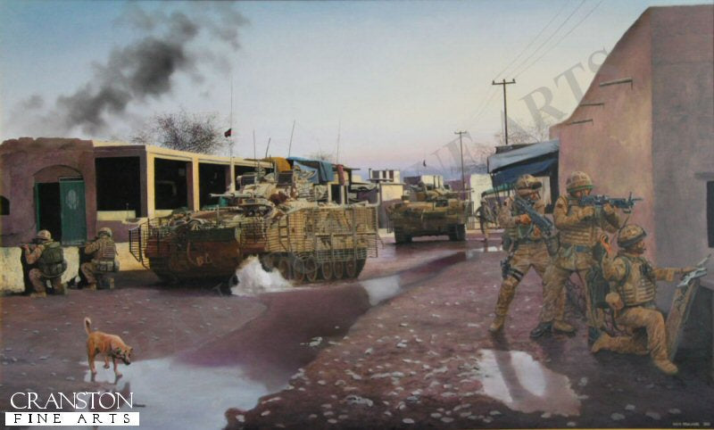 Right Flank, 1st Battalion Scots Guards was an independent armoured infantry company attached to 52 Brigade during Operation HERRICK 7. The company was equipped with Warrior armoured fighting vehicles. The successful retaking of the town of Musa Qal'eh from the Taliban in December 2007 was code-named Operation MAR KARADAD. The scene shows a morning raid to clear the area of Taliban, when Right Flank was working under the Household Cavalry Regiment Battlegroup.