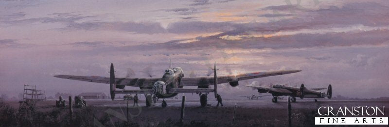 The evening mist begins to settle on the bleak airfield at Ludford Magna, Lincolnshire, as Lancaster aircraft of 101 Squadron taxi out for another dangerous nighttime sortie. The nature of their assignments during the war was a closely guarded secret. The unusual aerials on the front and top of the aircraft were used for intercepting and jamming messages between German fighter aircraft and their ground control.