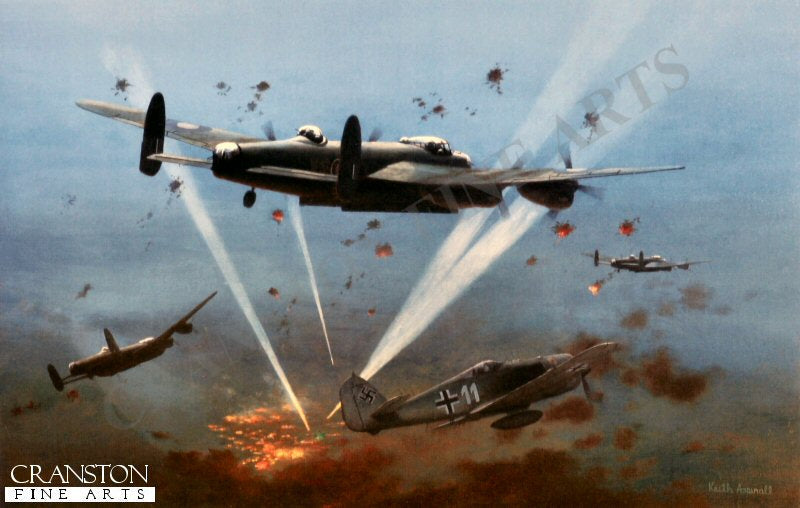 Part of the RAF Bomber offensive of night time raids over Germany, a Lancaster squadron not only dodge the German flak and searchlights but are also attacked by German night fighters. An Fw190 is shown about to attack a Lancaster bomber.