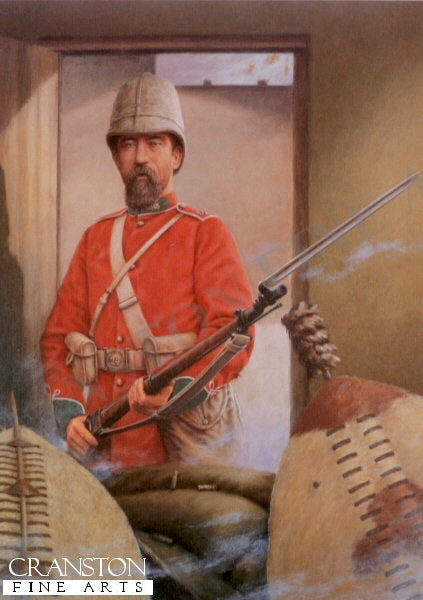 Private William Jones VC is shown in the art print standing in fornt of the doorway in the hospital as the Zulu warriors break into the hospital and rush the entrance. Private Robert Jones. Decorated for conspicuous bravery and devotion to the wounded at Rorkes drift. Private Robert and William Jones, posted in a room of the Hospital facing the hill, kept up a steady fire against enormous odds, and while one worked to cut a hole through the partition into the next room, the other shot Zulu after Zulu through the loophooled walls, using his own and his comrades rifle alternatively when the barrels became to hot to hold owing to the incessant firing. By their united heroic efforts six out of the seven patients were saved by being carried through the broken partition. the seventh, sergeant Maxwell being delirious, refused to be helped, and on Robert Jones returning to take him by force he found him being stabbed by the Zulus in his bed, Robert Jones died in 1898 in Peterchurch Herefordshire. Both men were awarded the Victoria Cross.