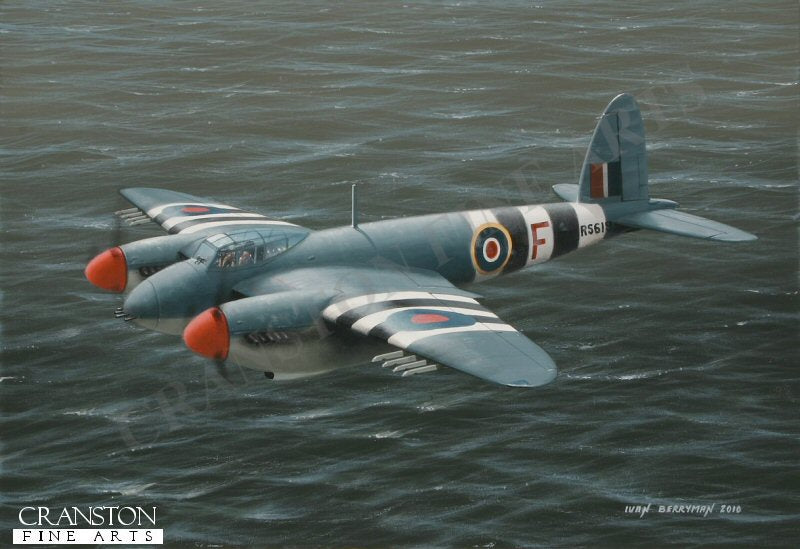 Rocket rails empty, Mosquito FB.VI RS619 (LA-F) of 235 Sqn races home low and fast after another successful anti-shipping strike in the Fjords of Norway. On a subsequent mission on 5th April 1945, this aircraft crash-landed in Denmark after suffering a glycol leak. Its crew, Ray Harrington and Bert Winwood, managed to get back home to the UK with the help of the Danish Resistance.